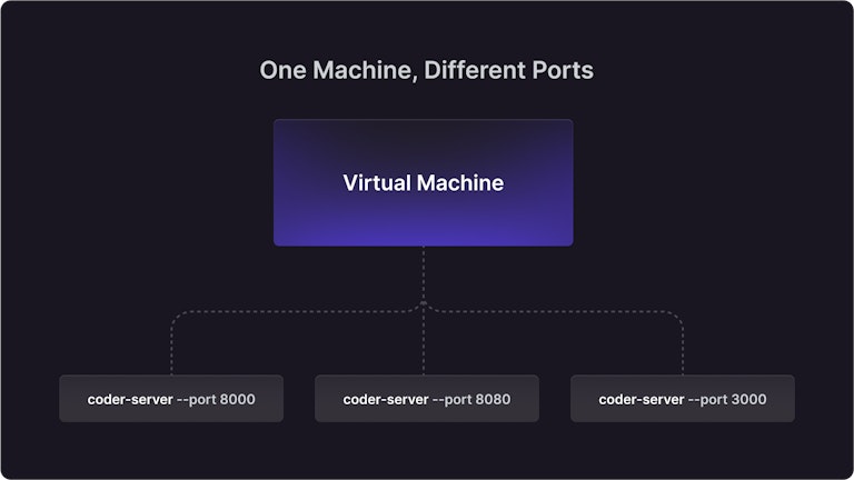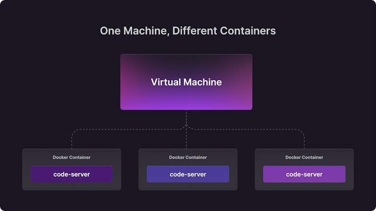 A common approach we’ve seen is to have one machine run multiple Docker containers each with their own code-server instance. We use this approach for dev.coder.com but use Coder to orchestrate it. This is similar to the previous approach except the Docker containers run in isolation. That means no file conflicts. Here’s a diagram with more details: