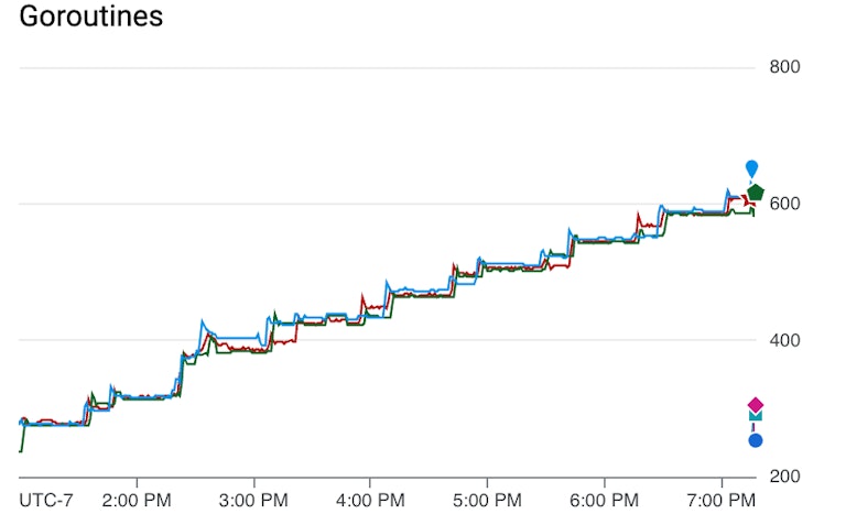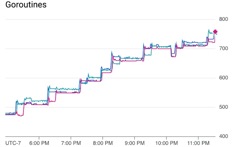 The spikes in goroutines are now mostly 47 minutes apart, although there is still some noise. This extra noise threw me for a loop, and made me wonder whether more than one job was responsible for the leaks. But, the power of choosing prime numbers means that job starts are staggered, and when looking at the peaks alongside metrics that show when jobs start and stop, the peaks always correlated with either the start or the stop of the same job.
