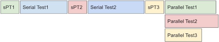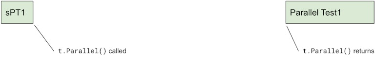 To keep the diagram readable, I’m going to abbreviate the serial portion of Parallel Test1 (the part before t.Parallel() is called) sPT1, and so on.