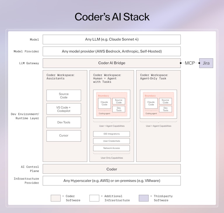 The next three layers are part of Coder software: an AI control plane, a development environment, and an LLM gateway.
