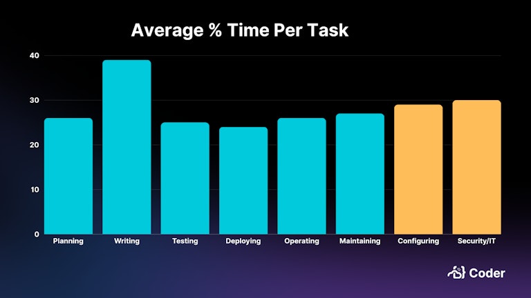 The teams in your enterprise might also be spending too much time on non-development activities. We commissioned a survey of 223 enterprise organizations about where their developers spend their time. They report spending as much or more time on configuring their development environments and complying with security and IT policies as they do tasks like planning, coding, and testing.