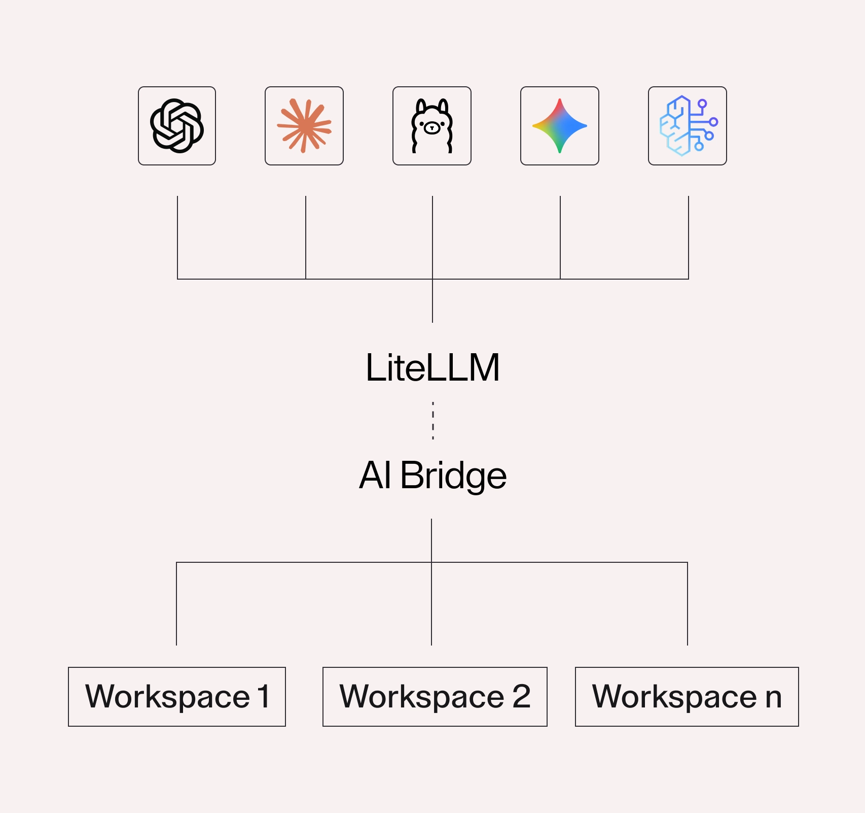 AI Bridge handles workspace governance, while LiteLLM handles multi-model routing
