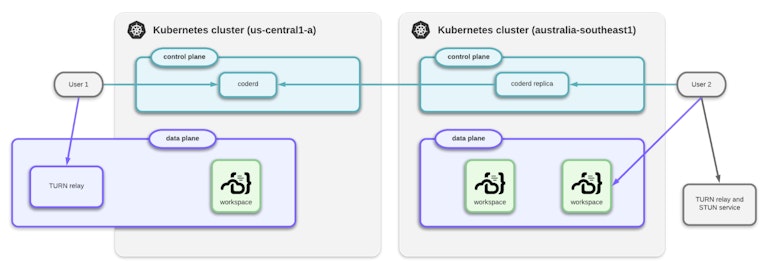 With our new networking model, Coder uses WebRTC to broker connections between the user and services running inside their workspace. In order to maximize compatibility and provide a clean migration path, our initial implementation uses the open source Pion TURN relay server. The relay provides a rendezvous point accessible to both the user and the workspace they are trying to access, and which may be located either inside or outside of the Kubernetes cluster, as long as it is able to receive inbound connections from both: