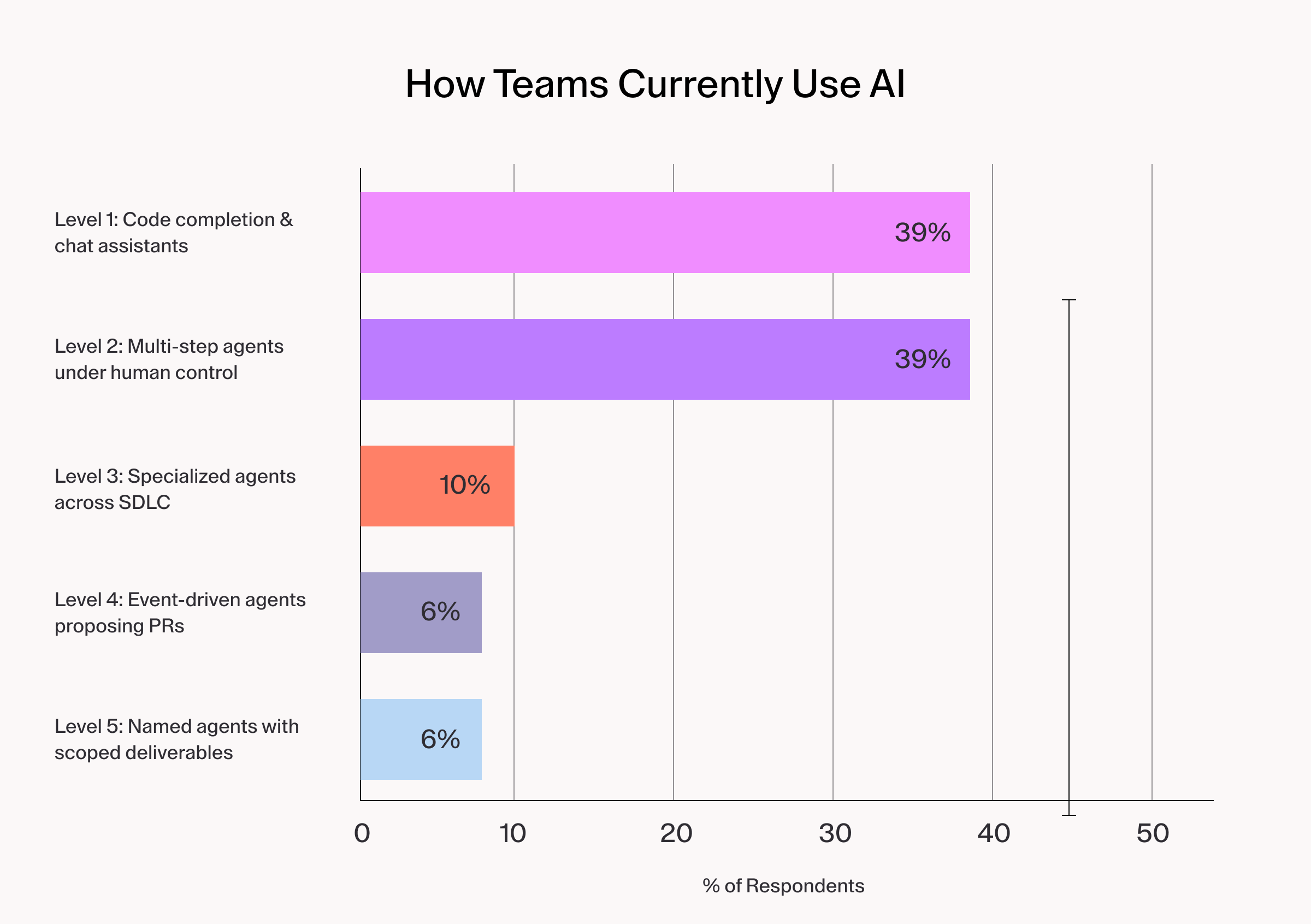 But the concentration tells a more specific story. Nearly 80% of respondents are still at the first two stages of the maturity model: Code completion tools and human-directed local agents. Only a small fraction have moved to cloud-based agents that respond to event triggers, and fewer still are experimenting with agents that identify their own work from product roadmaps or coordinate across the full development lifecycle. The field is early. Organizations that have not yet formalized their approach are not behind. They are exactly where structured adoption should begin.