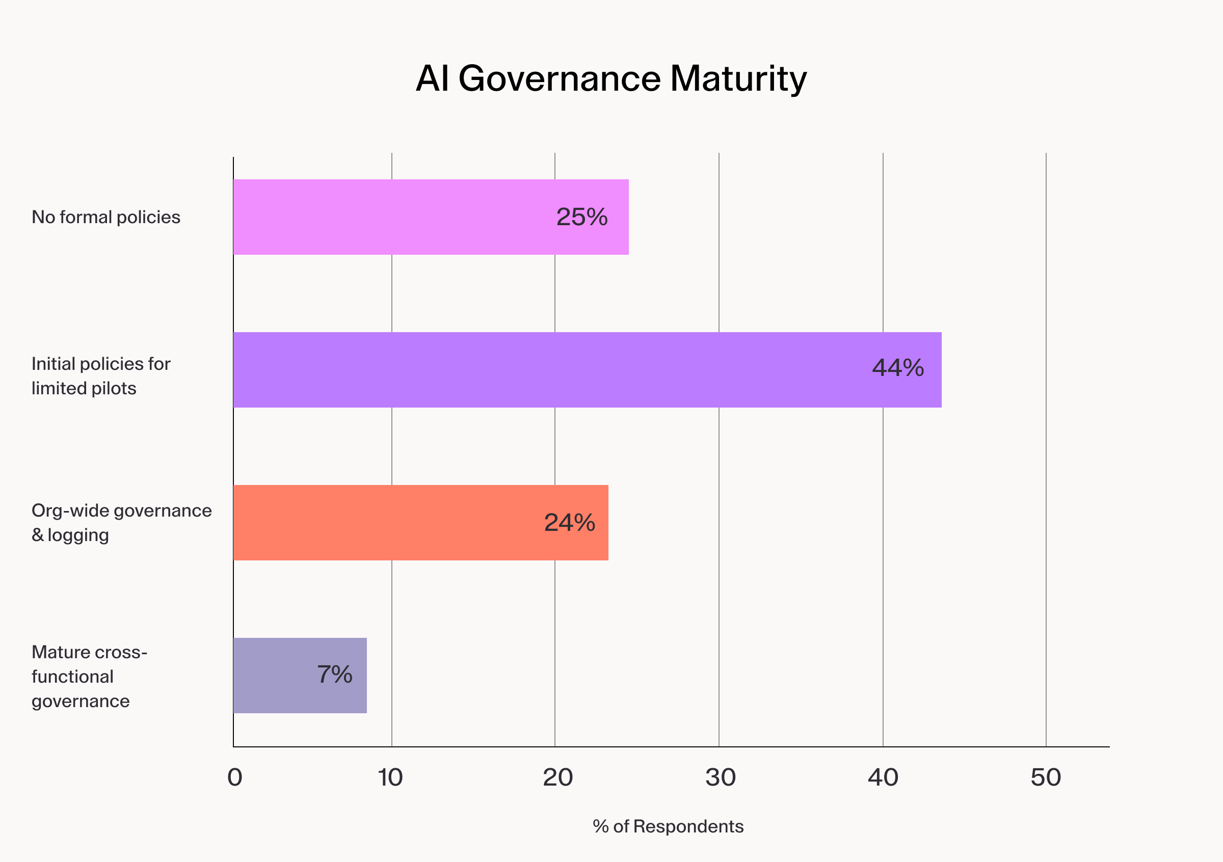 The real risk sits with the 44% running limited pilots under initial policies, moving toward broader agent usage without the infrastructure to support it. The gap between "we have some policies" and "we have organizational-level governance and environment standardization" is where most incidents occur and where governance debt compounds fastest.