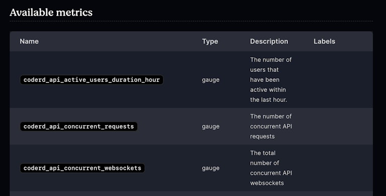 In November, we added documentation on using Prometheus with Coder as well as a number of metrics around measuring Coder's usage & performance.