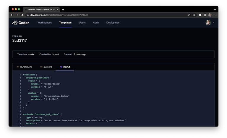 You can now preview Terraform and Markdown files within a template version from the Coder dashboard!