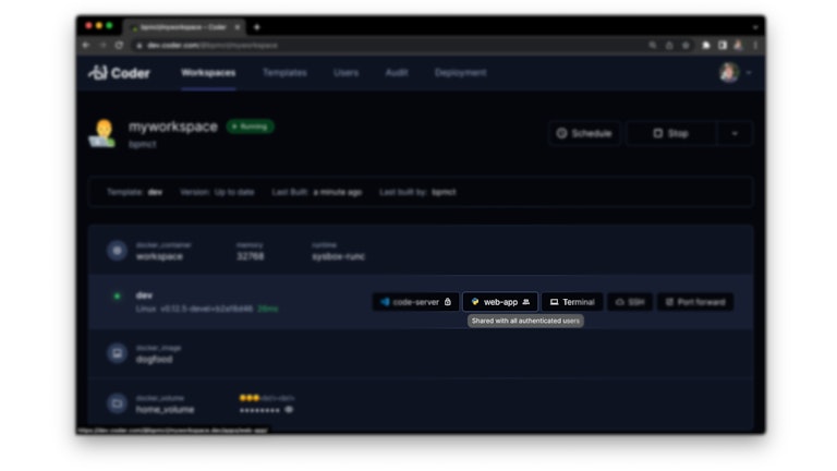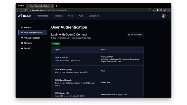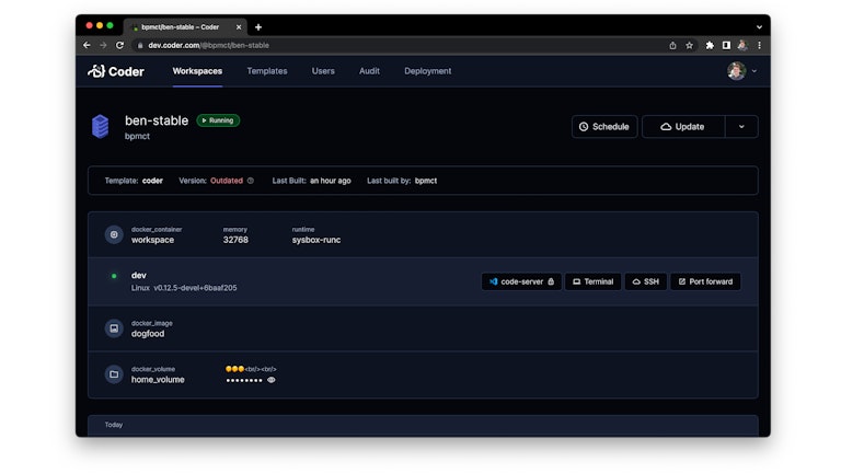 Many of the pages in the Coder dashboard have been revamped, including the workspace and resource view. There is also a new "Deployment" page which exposes Coder's configuration values to admins.