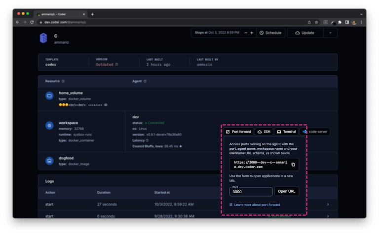 You can now access web applications running within your workspace through the dashboard. Go to the workspace page, enter the port, press "Open URL", and the Coder will launch you into your application. See the docs for more info.
