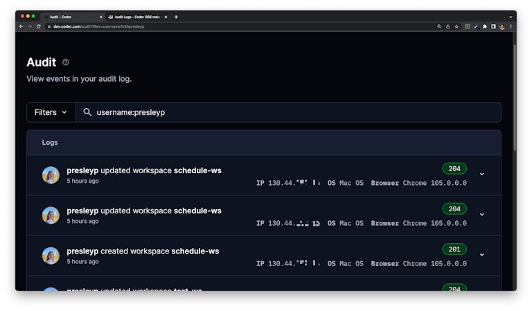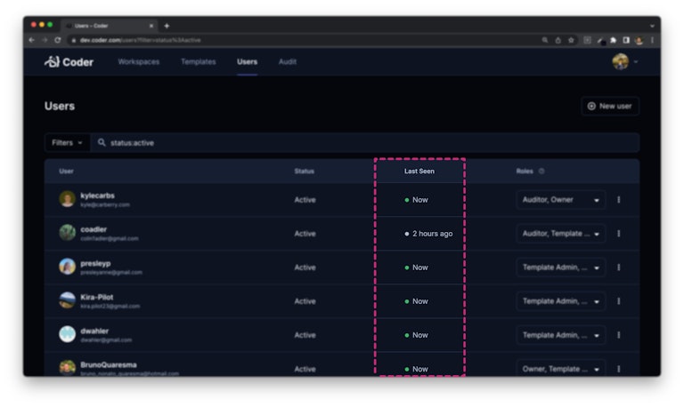 The Users page now shows when each user was last online. This information helps admins minimize cloud costs and measure internal Coder engagement.