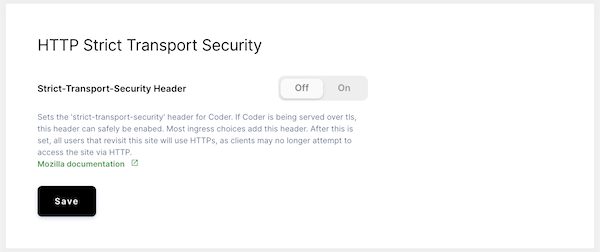 If you are serving Coder over HTTPS, we recommend enabling the Strict-Transport-Security Header option, which adds the HTTP Strict Transport Security header to responses. This browser feature requires future requests to occur over HTTPS.