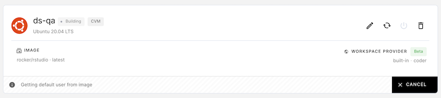 If Coder hasn't finished building or rebuilding your workspace, you have the option of cancelling this process. Cancelling the workspace will stop the workspace and release the resources needed for your workspace.