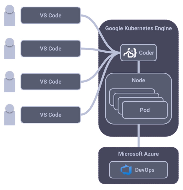 With this setup Coder and Kubernetes handle resource management as developer demand dictates. The SRE team no longer has to worry about idle VDI instances. With a standardized dev environment, there is no need to reinvent the wheel for devops. The SRE team is able to maintain their investment in Azure’s DevOps services.