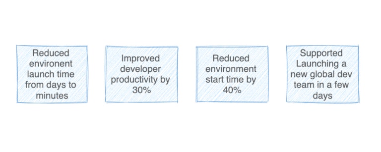 Skai reduced environment launch times from days to minutes, improved developer productivity by 30%, reduced environment start time by 40% and more.