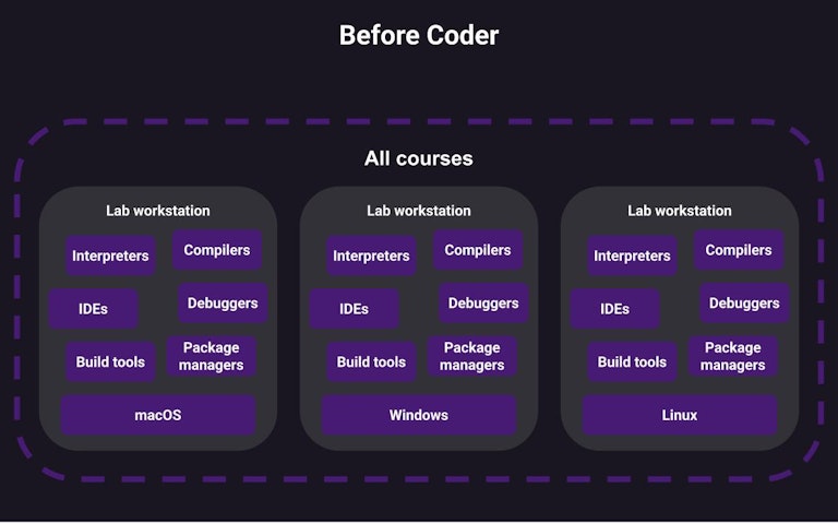 Each course has its own dev environment requirements. Before Coder, instructors provided detailed written instructions that covered installation on macOS, Windows, and Linux. Because students come from other majors besides computer science, these instructions couldn’t assume that students have experience with coding or even software installation.