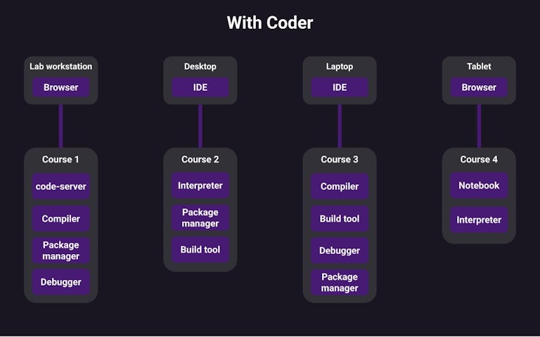 Coder workspaces give students ready-to-use, responsive remote dev environments. Whether working in an SCSS lab or remotely, each student in a course gets an identical environment. Coder gives them the choice of how they interact with their environments, either with a native IDE or with the web browser on their device, which, for students new to coding, is more familiar.